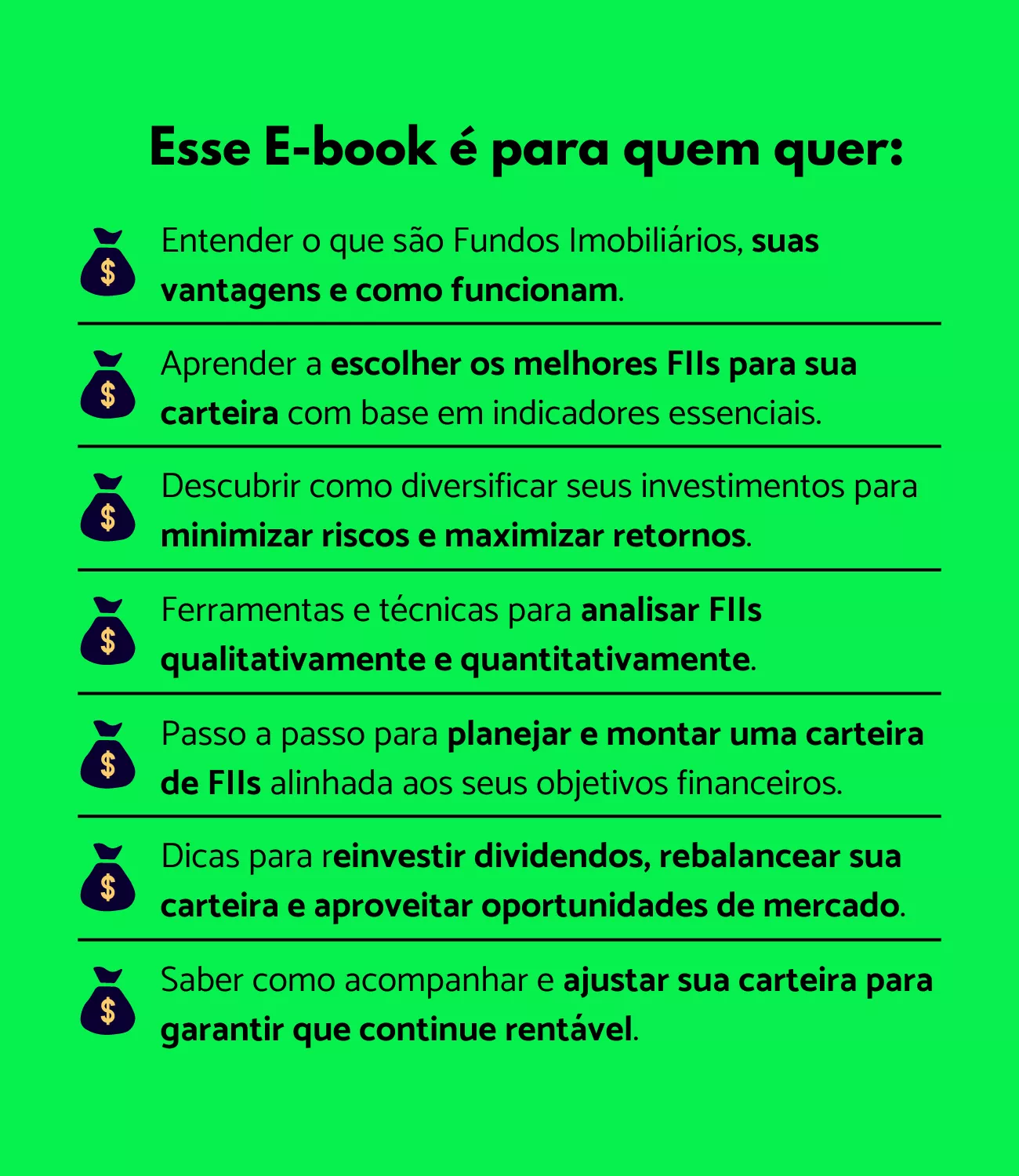 Esse produto é para pessoas que buscam mudar sua vida financeira criando uma renda passiva através de investimentos em Fundos Imobiliários.